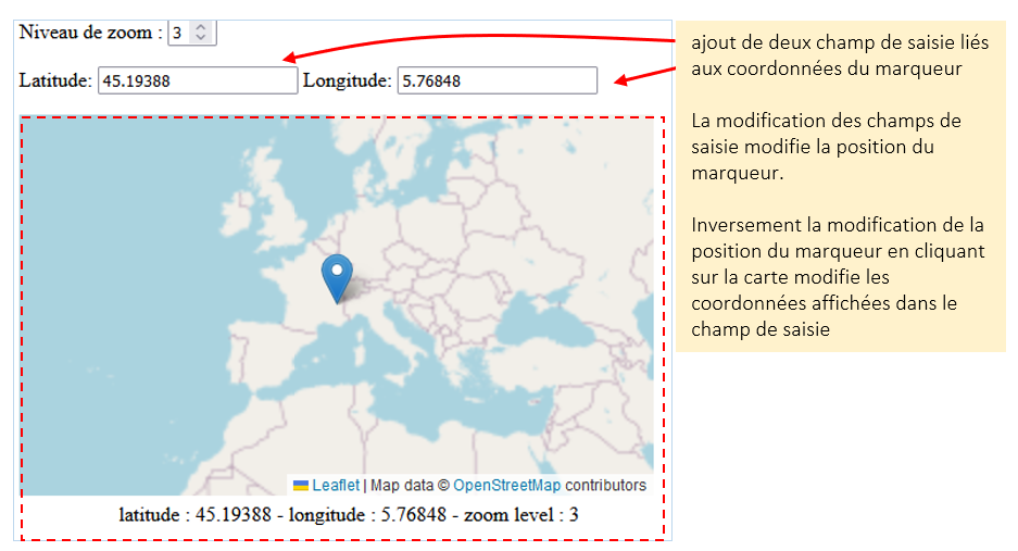 Question : Ajoutez à la page deux inputs permettant de fixer la position du marqueur (latitude, longitude) sur la carte. La modification de la valeur de la longitude ou de la latitude provoquant immédiatement la modification de la position du marqueur sur la carte et le recentrage de celle-ci.