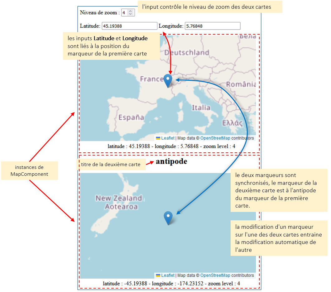 Par exemple si le premier marqueur est positionné au point (45.19388, 5.76848) correspondant à l'UFR IM2AG, la marqueur de la deuxième carte sera lui positionné au point (-45.19388, -174.23152) situé près de la Nouvelle Zélande.