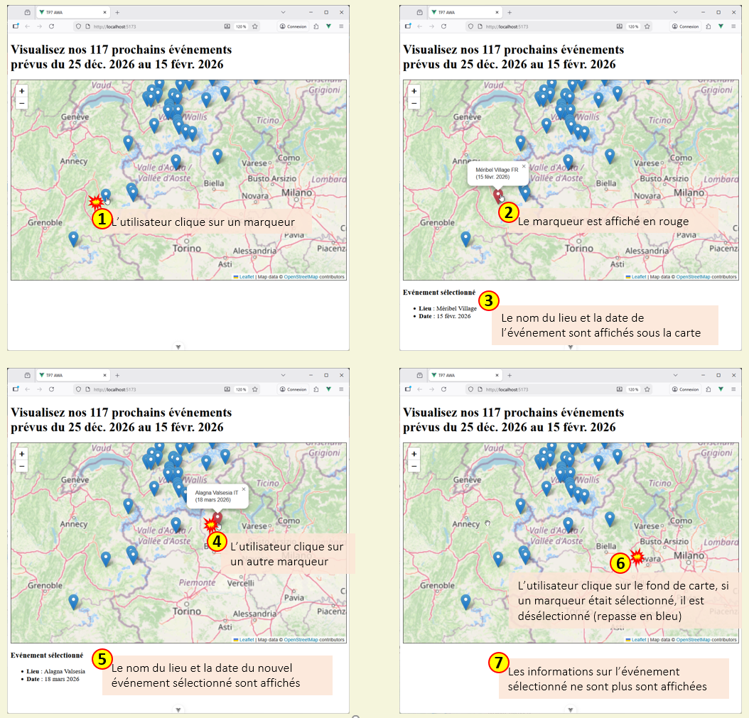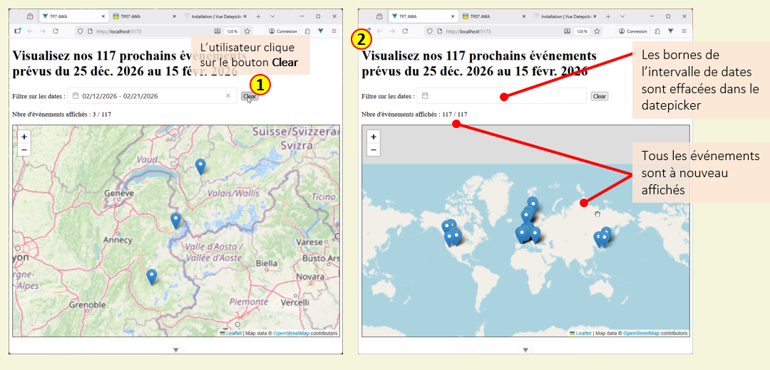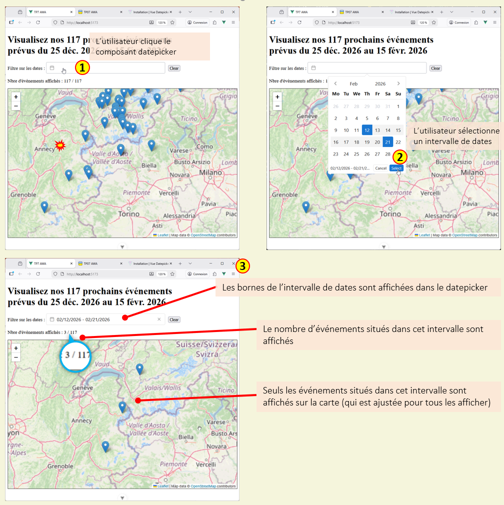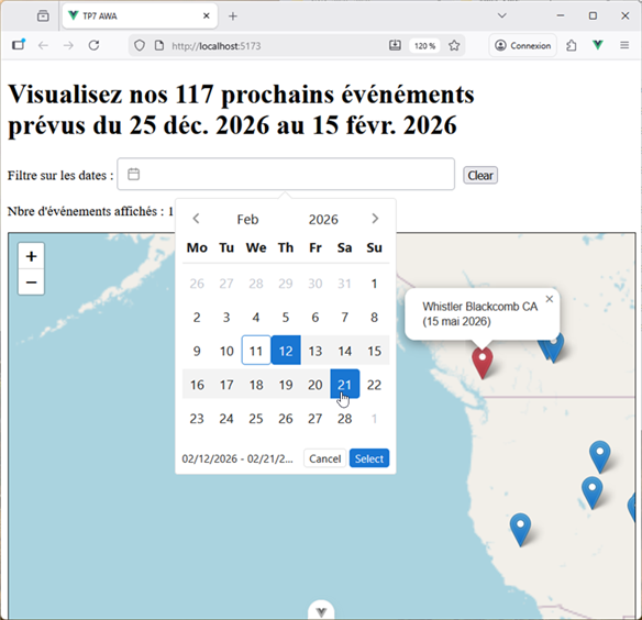 Pour ce TP, vous allez réaliser un application simple qui permet d'afficher sur une des marqueurs indiquant la localisation géogrpahiques d'événements (fictifs) ayant lieu en 2026. Votre travail va consister à partir d'une application existante écrite avec l'API de Composition et de la compléter afin d'offrir de nouvelles fonctionnalité, en particulier le filtrage des événements en fonction de leur date. Pour cela vous utliser un composants prédéfini (composant sur étagère) : Vue DatePicker offrant de nombreuse possibilité de sélection de dates et la définition d'intervalles de temps.