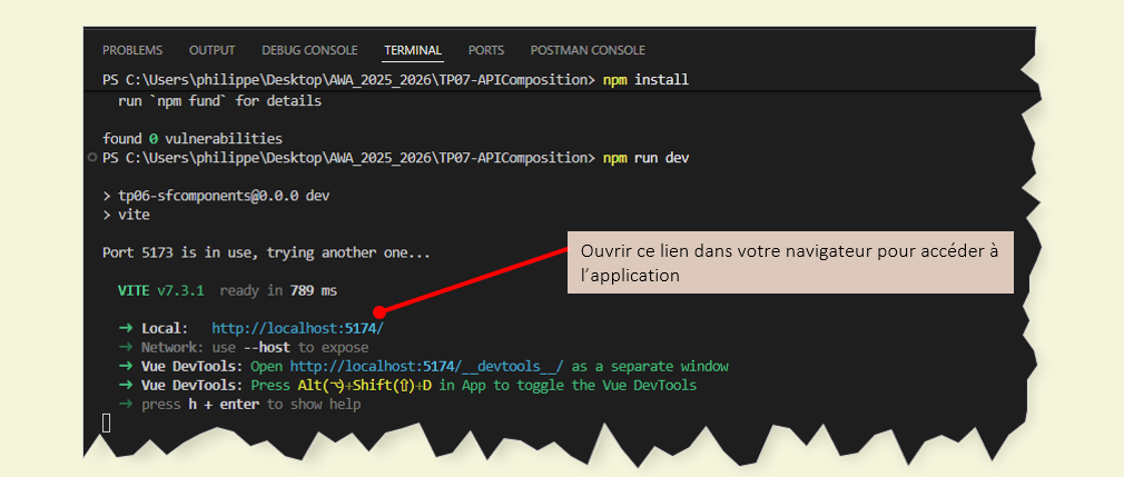 Tapez ensuite la commande npm run dev. Cette commande compile le projet en utilisant l'outil de build Vite Cette commande démarre le serveur de développement qui prend en charge la compilation en temps réel de votre application ainsi qu’une fonctionnalité “Hot Module Replacement” (HMR), qui permet aux développeurs de voir les modifications apportées à leur code en temps réel sans avoir à recharger la page.