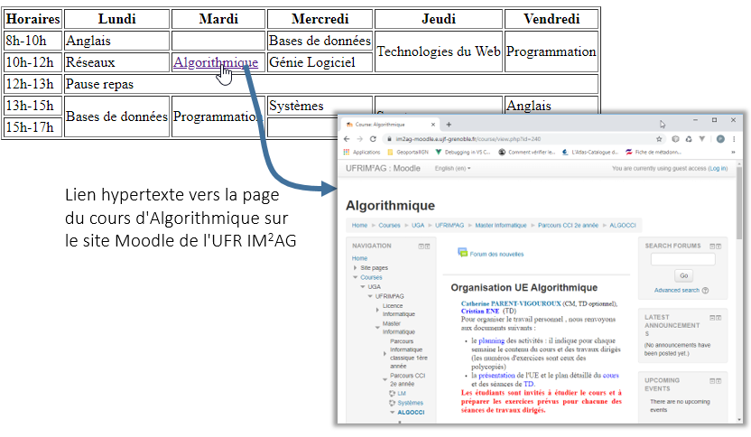 Des liens vers des ressources d'autres sites. Par exemple, dans la table présentant votre emploi du temps vous pourrez mettre un lien entre le nom de matière et le site web de celle-ci si elle existe. Ainsi pour le cours d'Algorithmique, vous pouvez ainsi pointer vers la page moodle du cours Algorithmique du M2CCI de l'ufr IM2AG.