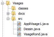 Sauvegardez dans le répertoire src les fichiers sources des différentes classes de l'application : VisageRond.java , Dessin.java et AppliVisage1.java