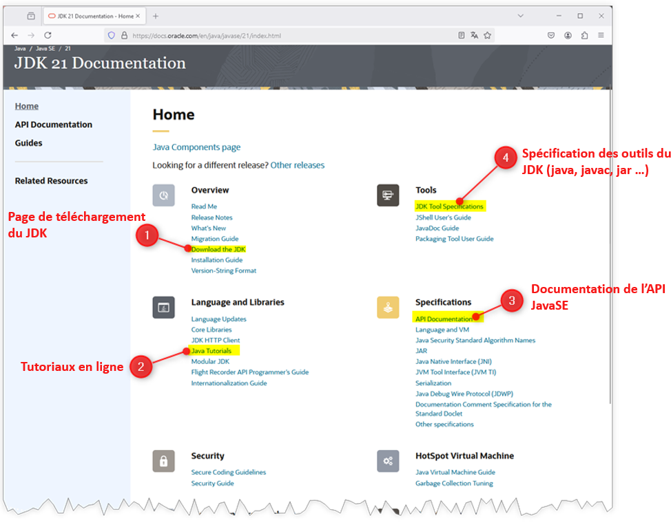 La documentation de Java SE version 21 est disponible à l'URL http://docs.oracle.com/javase/21 et vous permet d'accéder à un important ensemble de ressources concernant la plateforme Java SE dont vous allez consulter une (petite) partie dans les exercices qui suivent.