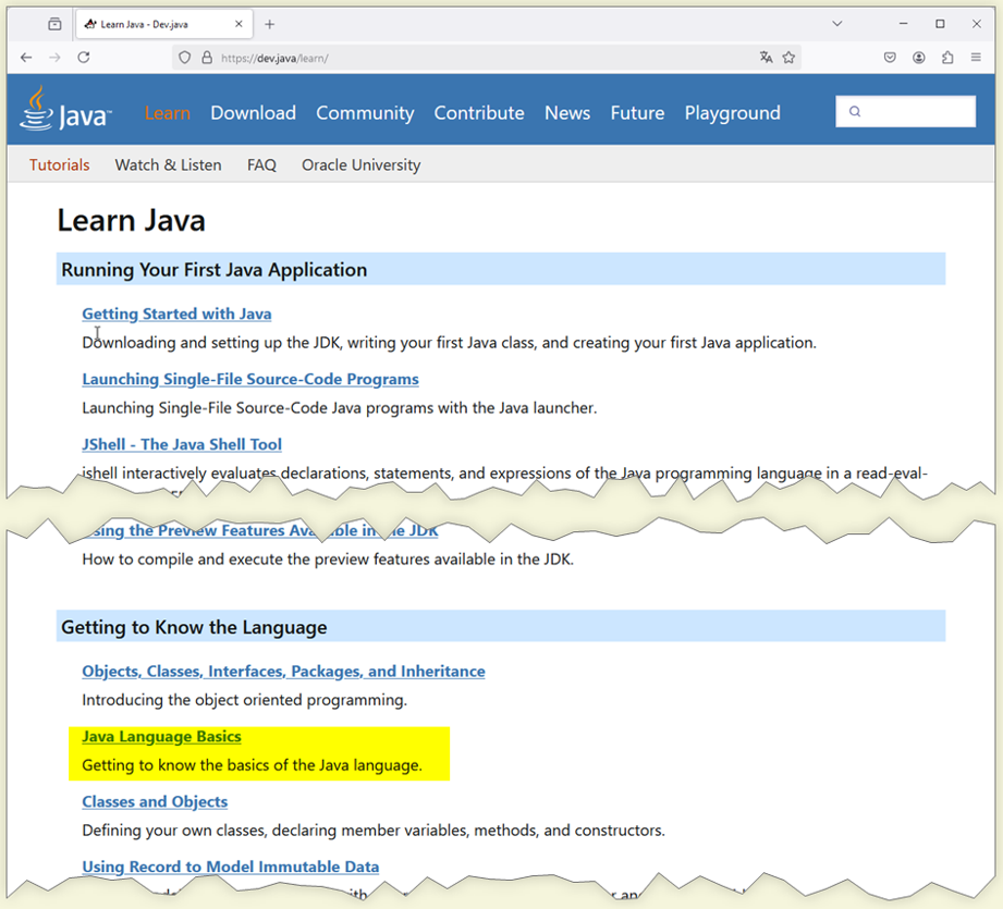 Exercice 1.1.2 : comme vous l'avez probablement trouvé dans l'exercice précédent le site dev.java propose sur la page https://dev.java/learn/ un certain nombre de tutoriaux modernes prenant en compte les dernières évolutions du langage Java. Ces tutoriaux sont regroupés en différentes catégories (Running Your First Java Application, Staying Aware of New Features, Getting to Know the Language, Mastering the API ...).