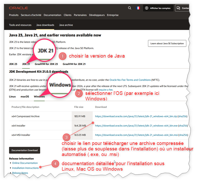 Pour l'installation sous Windows vous pouvez vous référer à la vidéo installer JDK 17 sous Windows 10. Pour la version 21 l'installation est similaire que ce soit sous Windows 10 ou Windows 11.