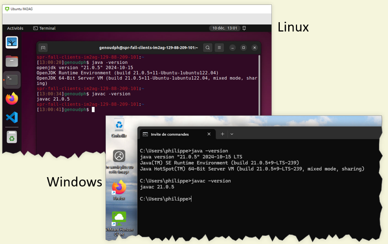 Si vous n'obtenez pas les réponses attendues, il faut installer le JDK et configurer votre environnement avant de pouvoir travailler. Il vous est recommandé d'installer la version 21 qui correspond à la version utilisée sur les machines de l'UFR IM2AG et est la dernière version LTS (Long Time Support) en date au 10/12/2024.