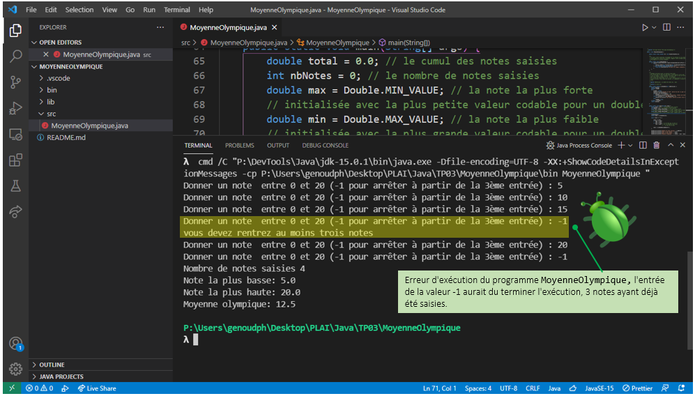 - Corrigez le bug, et vérifiez que le programme s'exécute correctement et peut être arrêté une fois trois notes saisies.