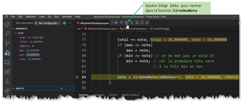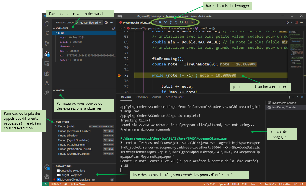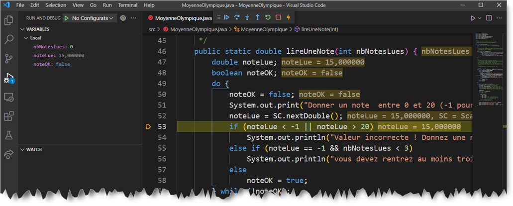 Pour comprendre l'origine de cette erreur vous allez utiliser le debugger de Java intégré à VSCode qui vous permettra de positionner des points d'arrêt, d'effectuer une exécution pas à pas et d'observer l'état des variables.