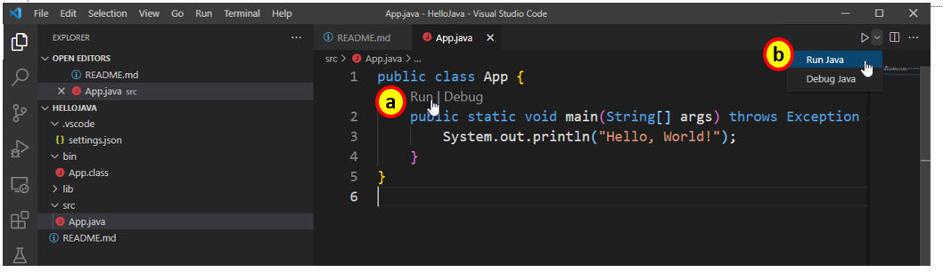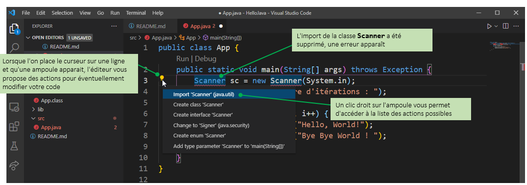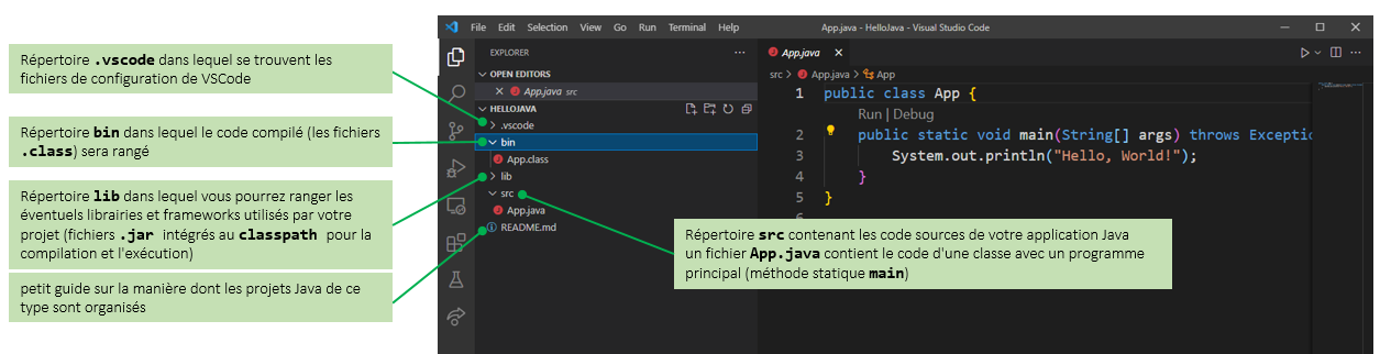 Vous allez maintenant modifier le code de la class App pour voir rapidement quelques une des possibilités de l'éditeur Java de VSCode.