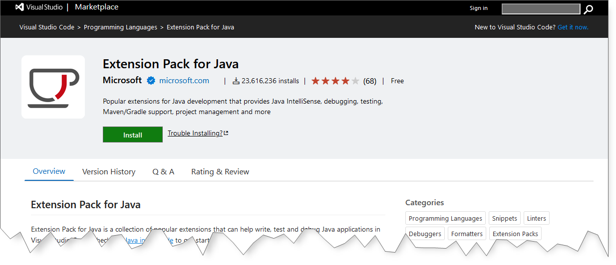 Avant toute chose, il faut au préalable que vous ayez installé un JDK 17 ou + sur votre ordinateur. Il vous faut ensuite ajouter à VSCode les extensions qui vous permettront de travailler avec le langage Java. L'Extension Pack for Java regroupe les extensions de base les plus populaires qui vous aideront à développer en Java sous VSCode.