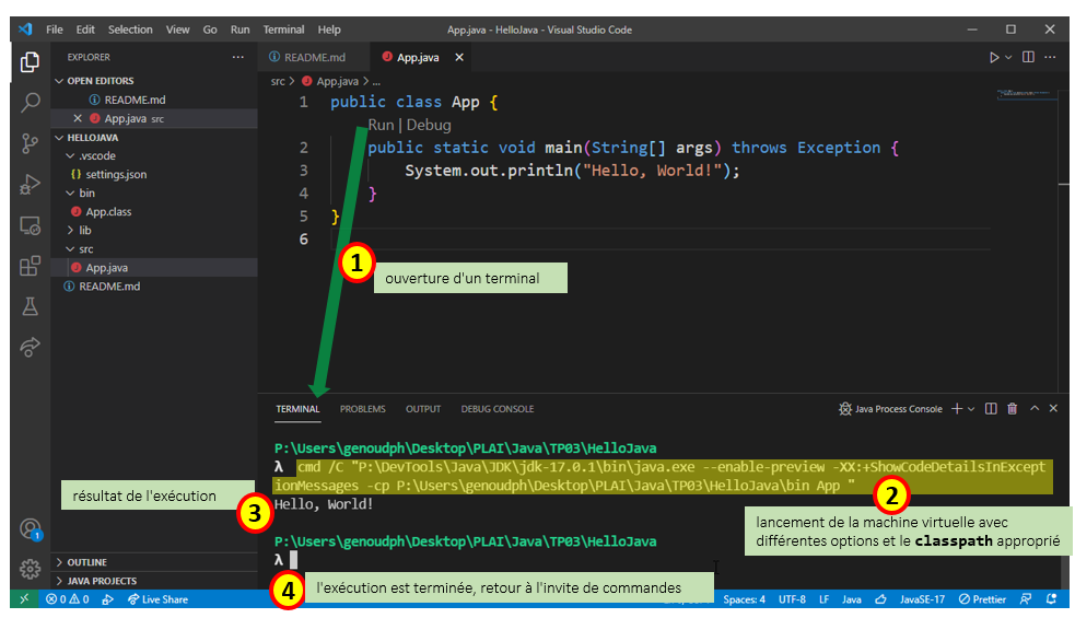 Une fois l'exécution lancée, VSCode ouvre automatiquement un terminal dans lequel il execute la commande java avec les options adéquates pour exécuter le code de la classe App.java. La figure ci dessous vous montre le déroulement de cette exécution.