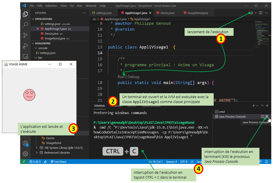 Compilez et exécutez AppliVisage1. Le programme principal (méthode main) d'AppliVisage1 est constitué d'une boucle infinie qui à chaque itération effectue un déplacement