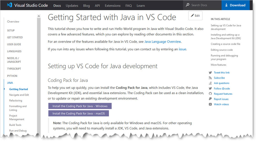 Dans ce qui précède, nous avons vu le strict minimum pour l'utilisation de VSCode pour l'écriture d'applications Java. Pour profiter aux mieux des très riches fonctionnalités de cet environnement, nous vous conseillons de parcourir la documentation en ligne et en particulier les tutoriaux suivants :