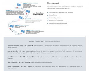 Le principe du dispositif citoyen était le suivant : proposer à 30 citoyens de la métropole grenobloise de se former aux enjeux de la sobriété numérique pour porter des recommandations aux élus de Grenoble Alpes Métropole (GAM), dans le but de faire évoluer leur schéma directeur sur le numérique. Le projet a été axé sur trois piliers : apprendre (sur les enjeux de la sobriété numérique), inventer (des mesures créatives pour la métropole) et débattre. En effet, plus qu’une simple consultation, l’enjeu était ici de former des citoyennes pour les rendre compétentes sur ces questions et pouvoir aussi faire résonner les débats sur ces thématiques dans leurs sphères personnelles. Un vrai engagement pour favoriser un débat démocratique large autour de la question de la sobriété numérique.