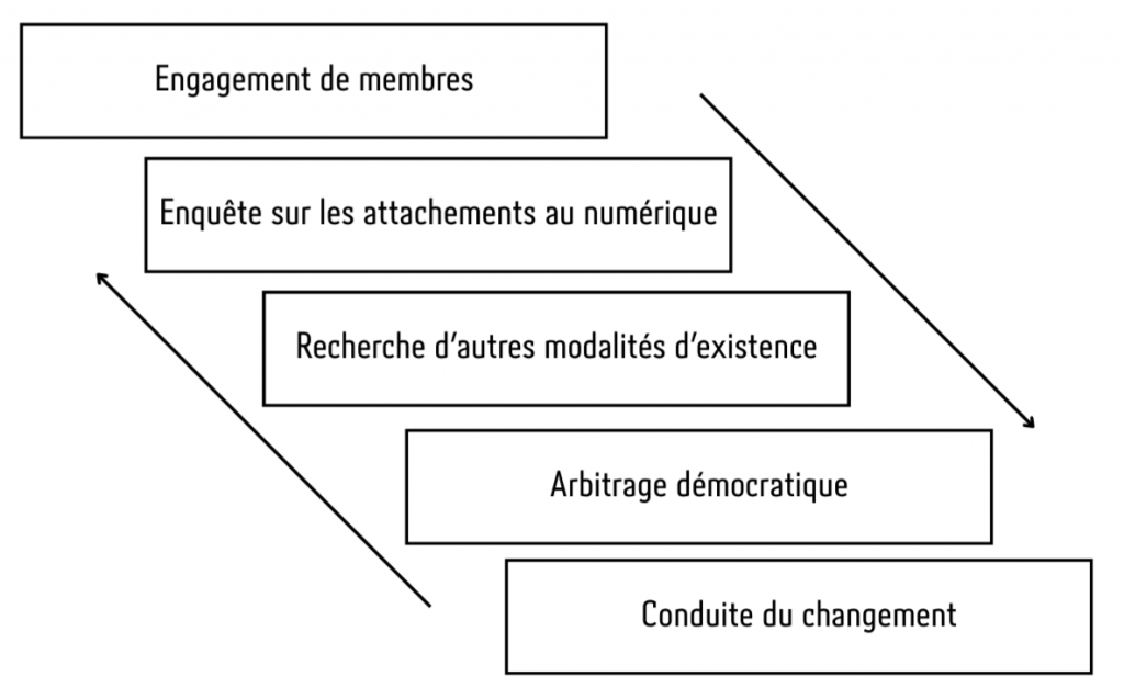 Poser ces questions à l’échelle des organisations que nous côtoyons (établissement scolaire, entreprise, mairie, syndicat, centre de santé, etc.) permet de ne pas se cantonner aux petits gestes individuels, ni à une critique trop globale du “système” sur lequel nous n’avons que peu de prises. Cela permet de s’organiser collectivement pour repenser la place du numérique à une échelle sur laquelle nous avons des leviers d’action forts.